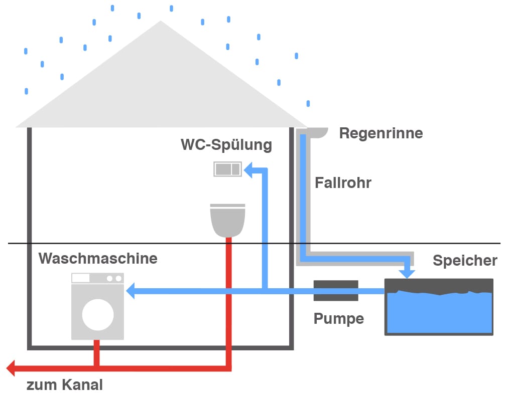 Das Regenwasser wird klassisch über eine Regenrinne gesammelt und in einem Erd- oder freistehenden Speicher gelagert. Über eine Filteranlage wird es dem Wasserkreislauf zugeführt. Da Regenwasser sehr weich ist, eignet es sich ideal für die Wäsche – zudem ist es eine gute Alternative für die Toilettenspülung, in der normalerweise sauberes Trinkwasser zum Einsatz kommt.